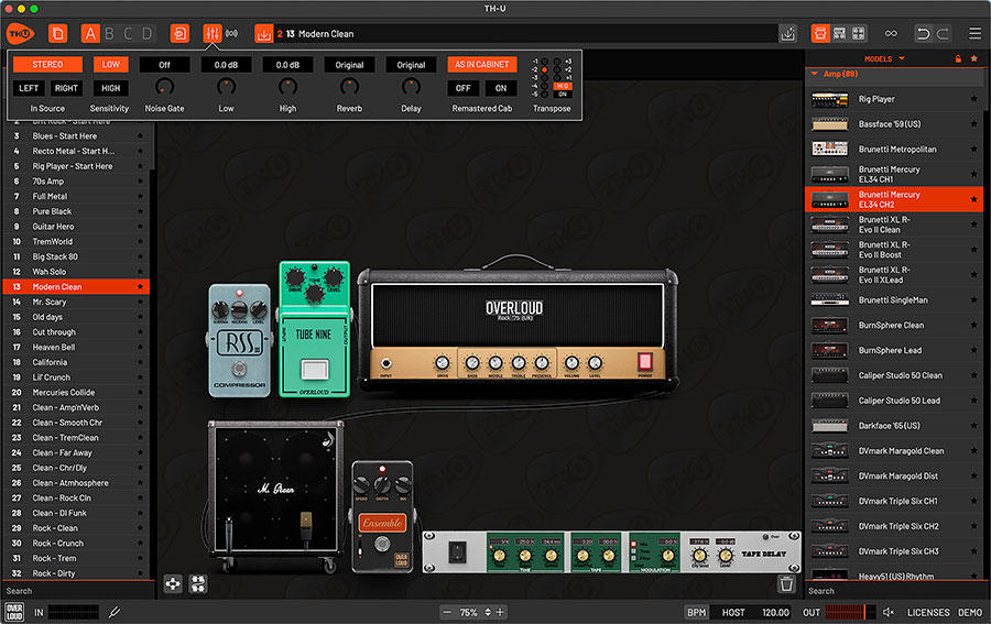 Overloud TH-U Premium 2025 es un kit de herramientas increíblemente completo y flexible para crear el sonido perfecto de guitarra o bajo. Es una fuente de sonido versátil que combina modelado, captura y procesamiento Fluid IR en un único plugin que lo distingue de muchos otros simuladores de amplificadores del mercado. También ofrece una amplia colección de técnicas de captura de amplificadores y altavoces, que permiten a los usuarios producir una amplia gama de tonos, desde clásicos vintage hasta modernos sonidos de alta ganancia. Es una aplicación multiplataforma que funciona a la perfección no solo en ordenadores (Mac y PC), sino también en dispositivos móviles. Esto abre un nuevo mundo de flexibilidad, permitiendo a los usuarios capturar ideas sobre la marcha o grabar demos de alta calidad dondequiera que estén. La interfaz gráfica de usuario es clara y sencilla, con un único panel unificado que ofrece acceso en tiempo real a todos los modelos, equipos e IR.